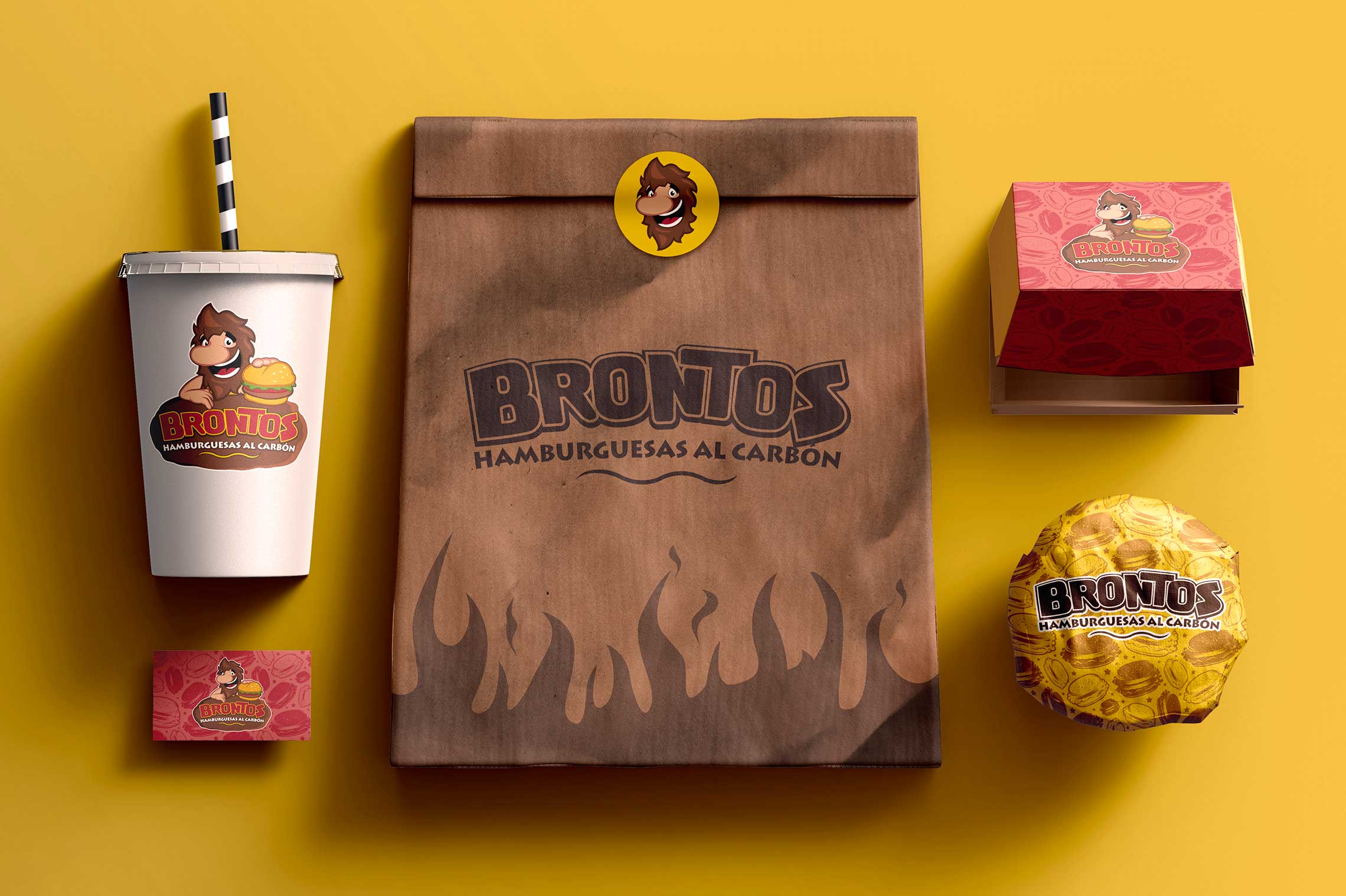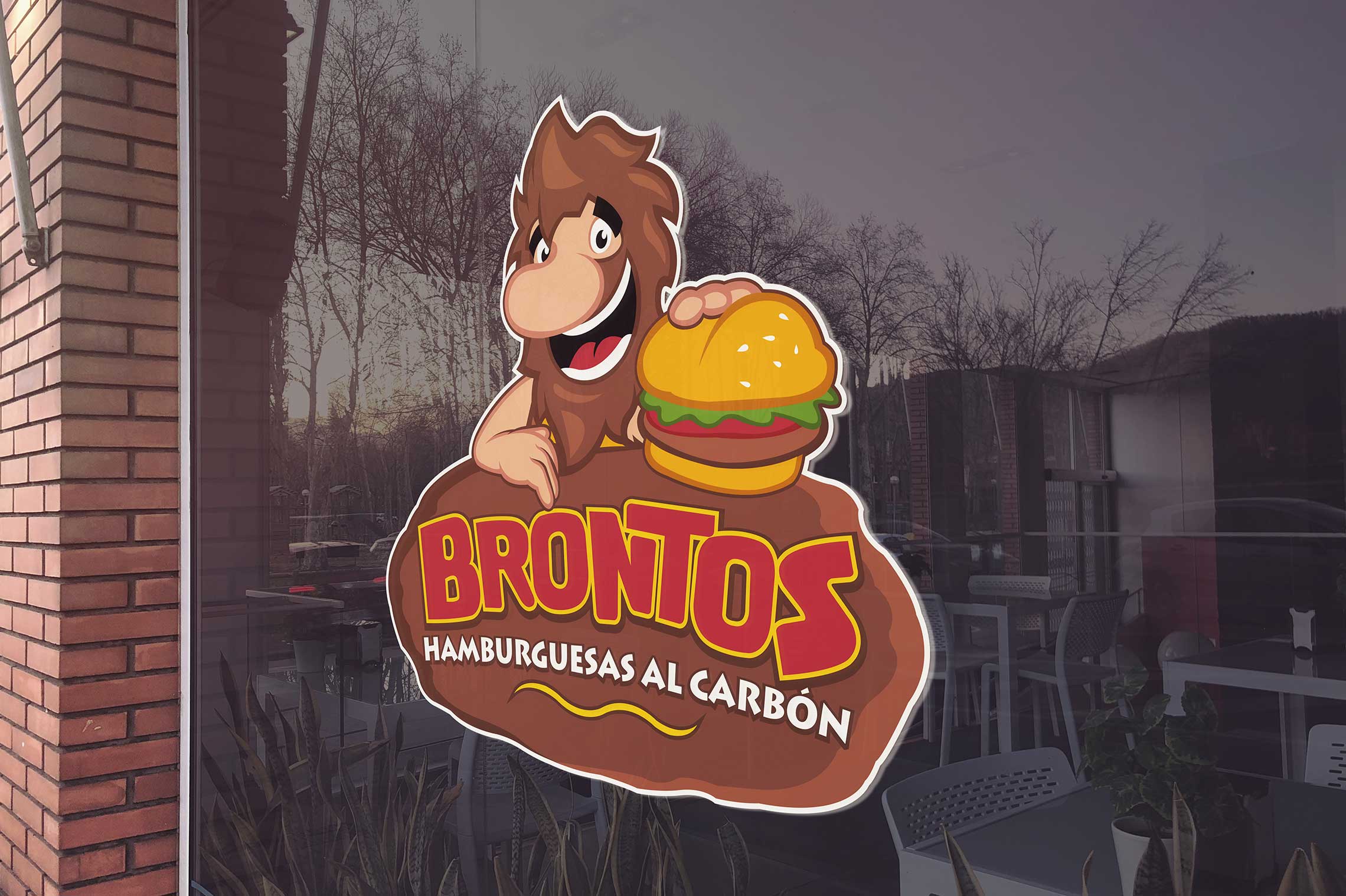 Rediseño de marca para Brontos hamburguesas al carbón. Se creo un logotipo caricaturesco y un personaje con el fin de crear empatía con el público objetivo.