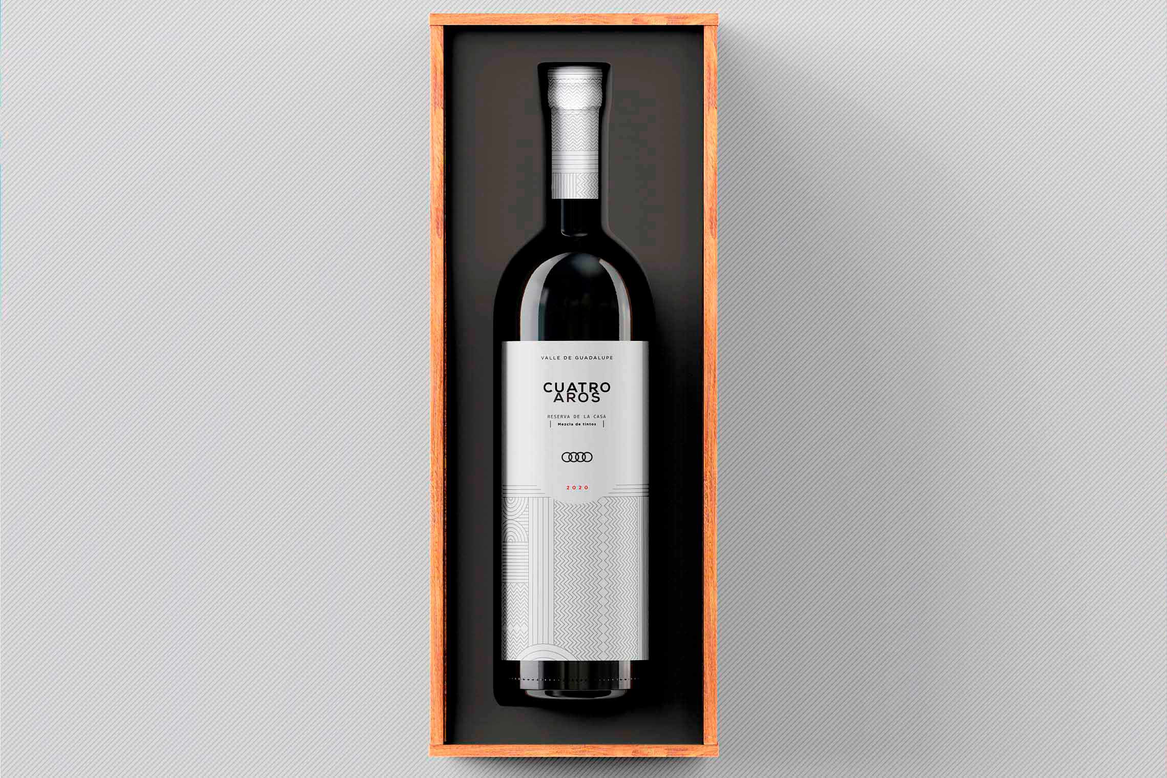 Se comisionó hacer unas botellas de vino con un diseño minimal y geométrico con el nombre de ¨Cuatro Aros¨, alusivo al logotipo de Audi.