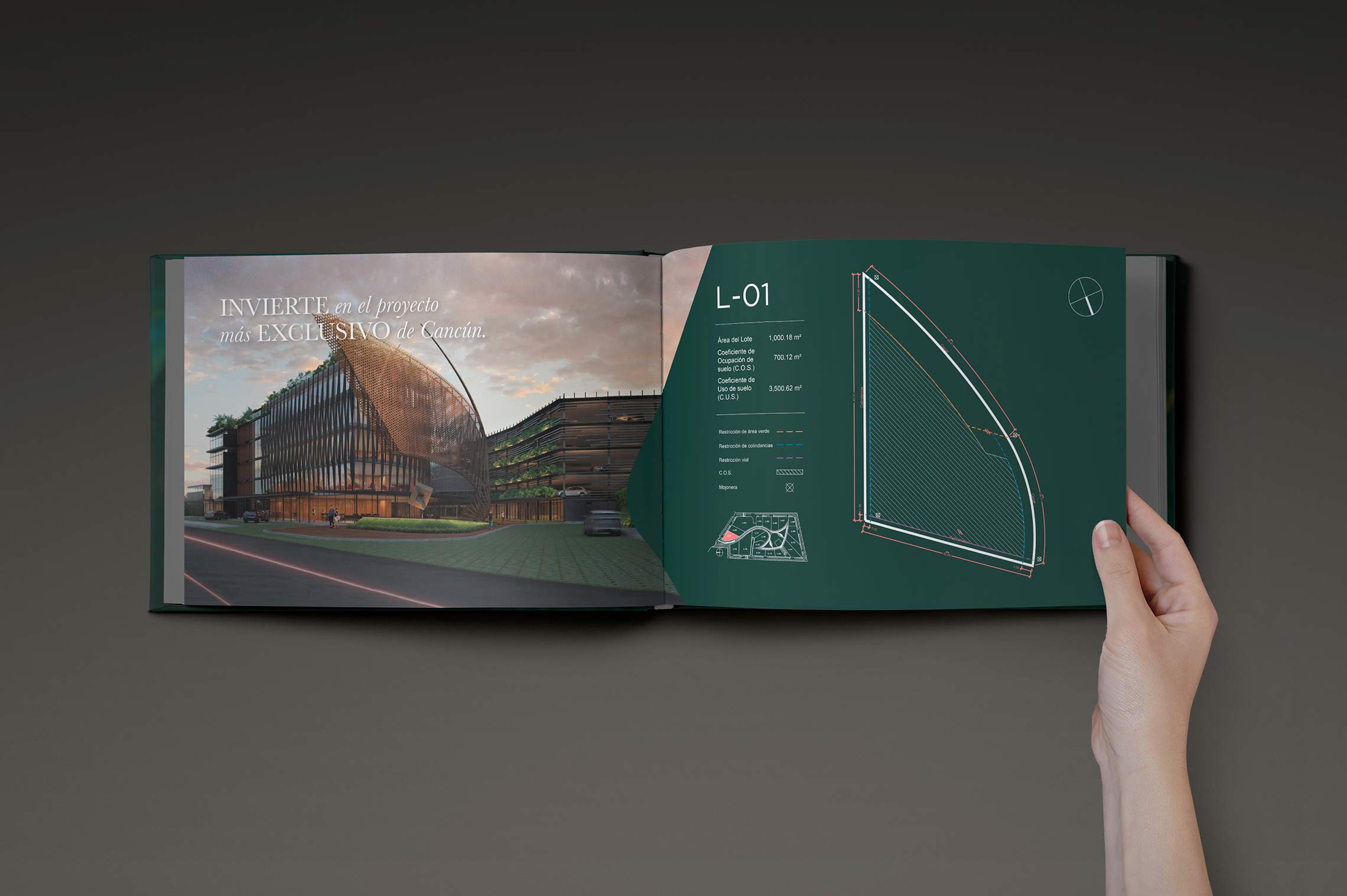 Desarrollo de marca para proyecto inmobiliario de macro lotes en Puerto Cancún. Se creó el logotipo aplicando un trazo lineal con textura metálica, con el fin de seguir la línea definida del grupo Luximia.